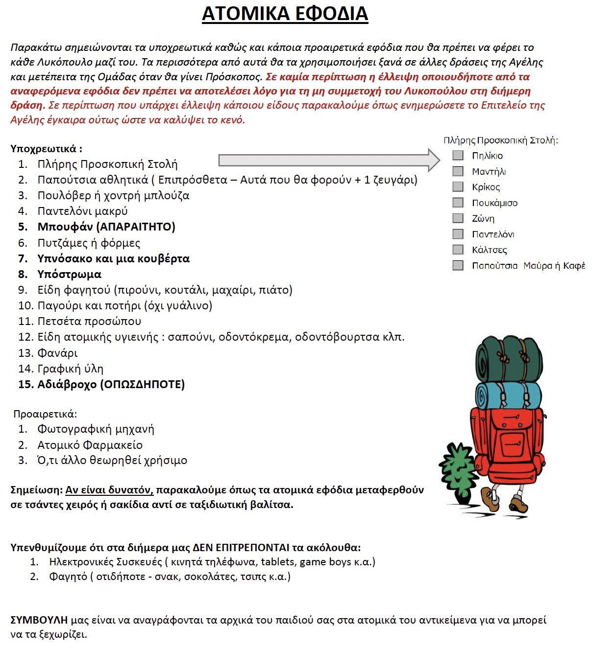 Τέλος, για σκοπούς διευκόλυνσης σας, επισυνάπτουμε τα ατομικά εφόδια που θα χρειαστεί το κάθε Λυκόπουλο κατά τη διήμερη δράση.